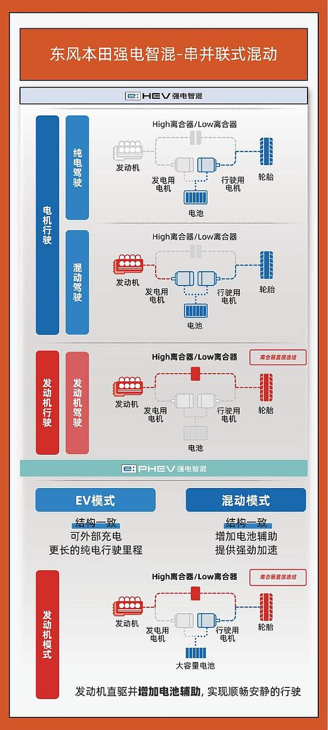- 三大模式:EV 纯电 → 混动串联 → 发动机直驱本田中国
